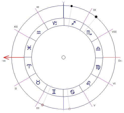 В данной иллюстрации восходящее Солнце на горизонтальной линии (горизонт) на Востоке. Такую картину можно наблюдать утром. Момент восхода Солнца совпадет с точкой Асцендента.